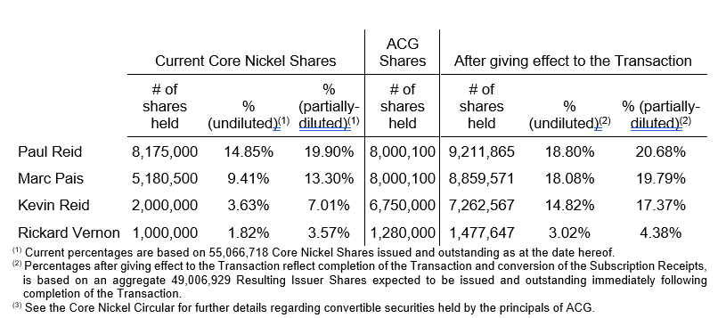 Certain directors, officers and significant shareholders of ACG beneficially own or control, directly or indirectly, Core Nickel Shares. The table below sets out, for each of these individuals, the current number of Core Nickel Shares held, the current percentage of Core Nickel Shares held on both an undiluted and partially diluted basis, and the anticipated effect of the Transaction on that person’s percentage ownership of Core Nickel’s equity securities, on both an undiluted and a partially-diluted basis.