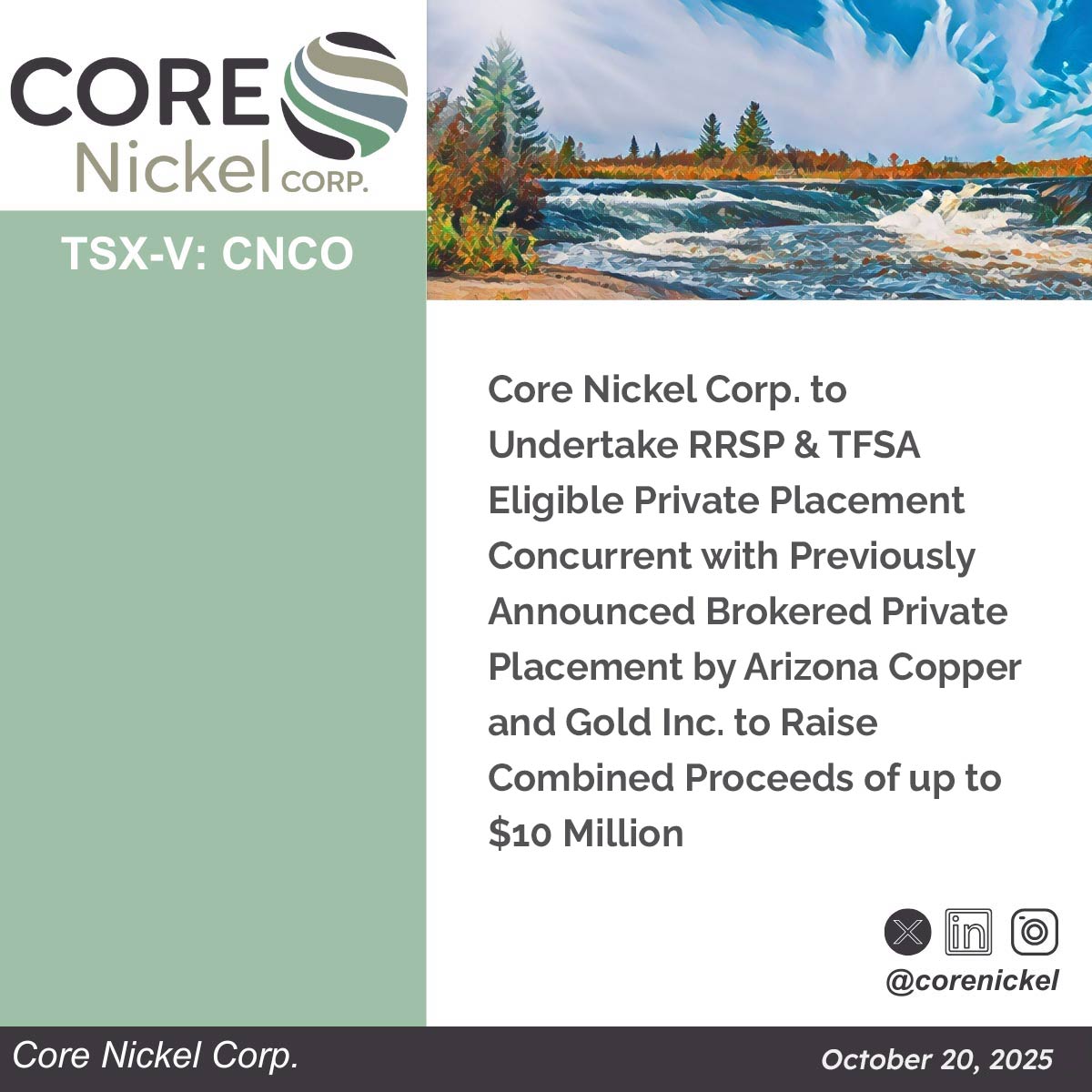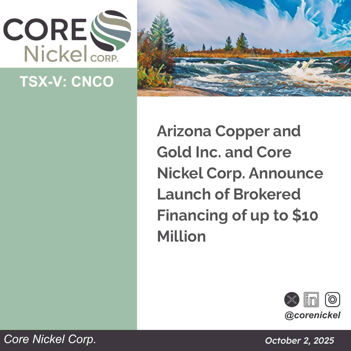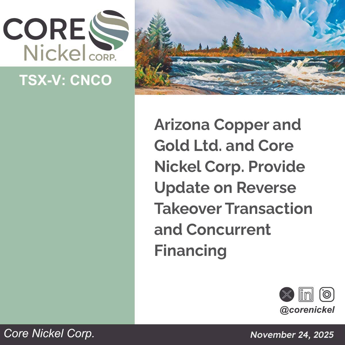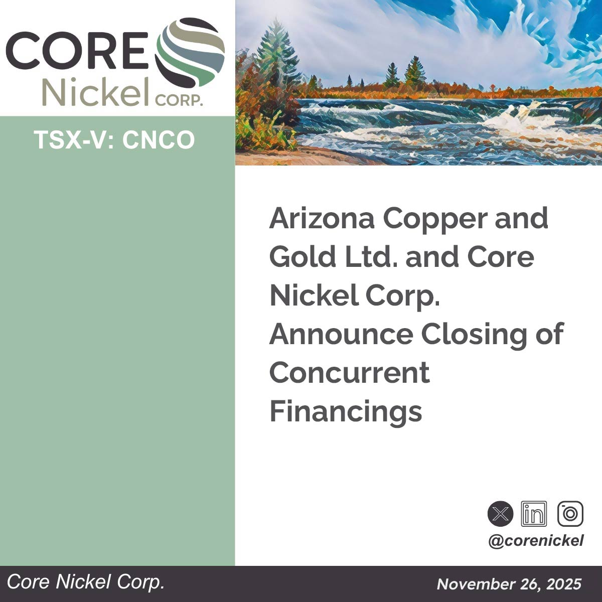Not for distribution to U.S. news wire services or for dissemination in the United States. Toronto, Ontario – November 26, 2025 – Arizona Copper and Gold Ltd. (the “Company” or “ACG”) and Core Nickel Corp. (TSXV: CNCO) (“Core Nickel”, and together with ACG, the “parties”) are pleased to announce the closing of their previously announced … Arizona Copper and Gold Ltd. and Core Nickel Corp. Announce Closing of Concurrent Financings